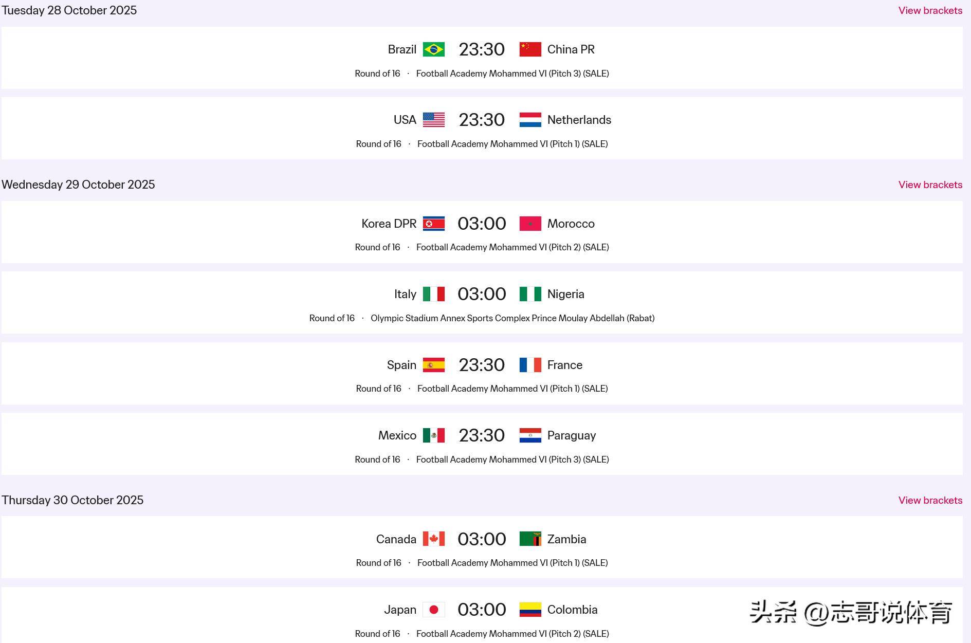 上半区:巴西队VS中国队、加拿大队VS赞比亚队、朝鲜VS摩洛哥、日本VS哥伦比亚队
